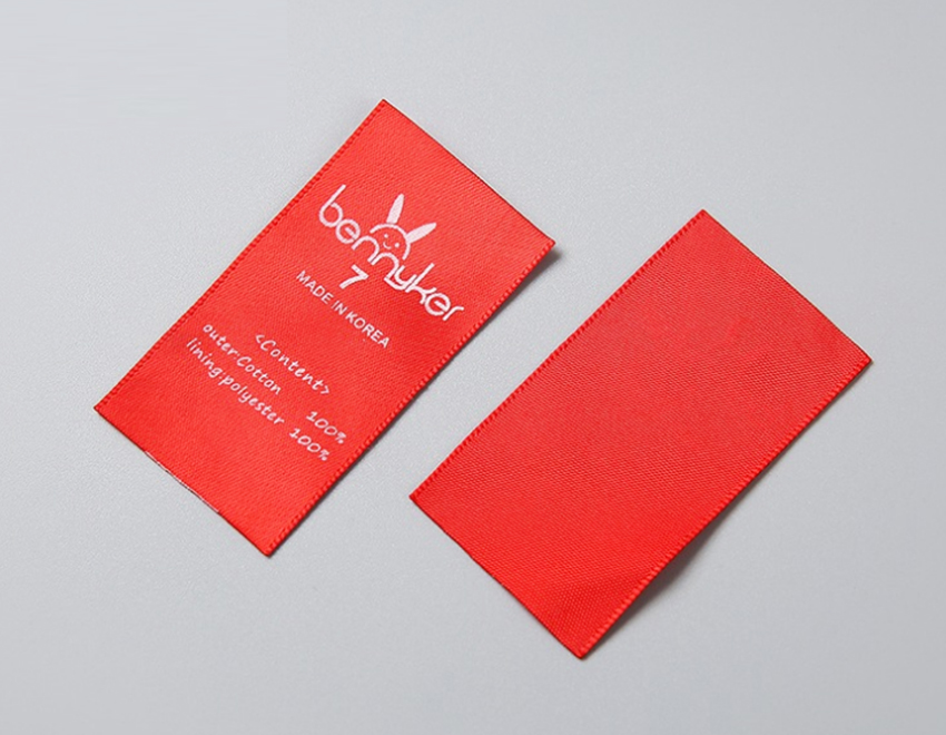 織嘜標簽:是服裝服飾上使用特別廣泛的一種商標,是根據圖形的色彩而選用不同顏色的紗線在織標機上直接織出來的一種商標,優點是不掉色,因為是完全織在上面的,有立體感,織的方式多樣,有檔次感,缺點,周期長,對顏色要求嚴格的需要紗線染色,所以對起訂量有要求。