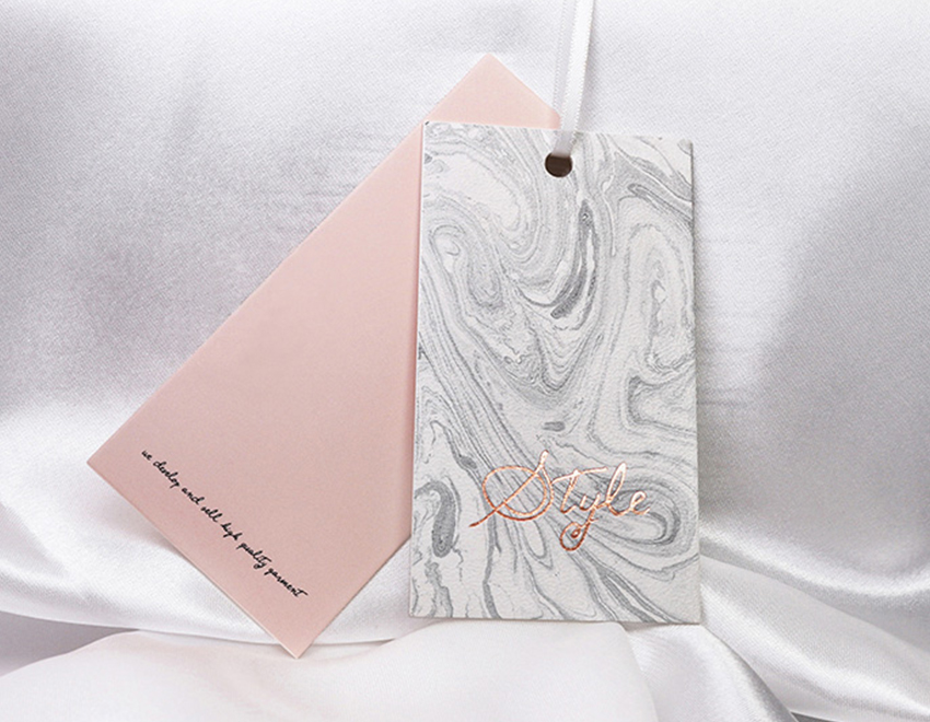 特殊工藝吊牌:服裝吊牌即各種服裝上吊掛的牌子,包含一些服裝材質,洗滌注意事項等信息。這種特殊工藝的吊牌的制作,在黑卡紙上做局部UV的圖案和標識,已達到增強吸引眼球的效果。